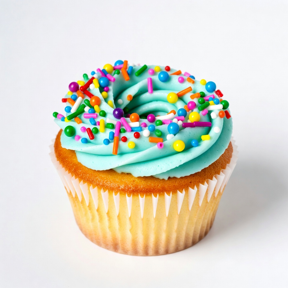 bakery, blue frosting, cake, dessert, food, golden cake, isolated background, multicolored sprinkles, pastry, rainbow sprinkles, sweet treat, swirled frosting, turquoise frosting, white background, cupcake
