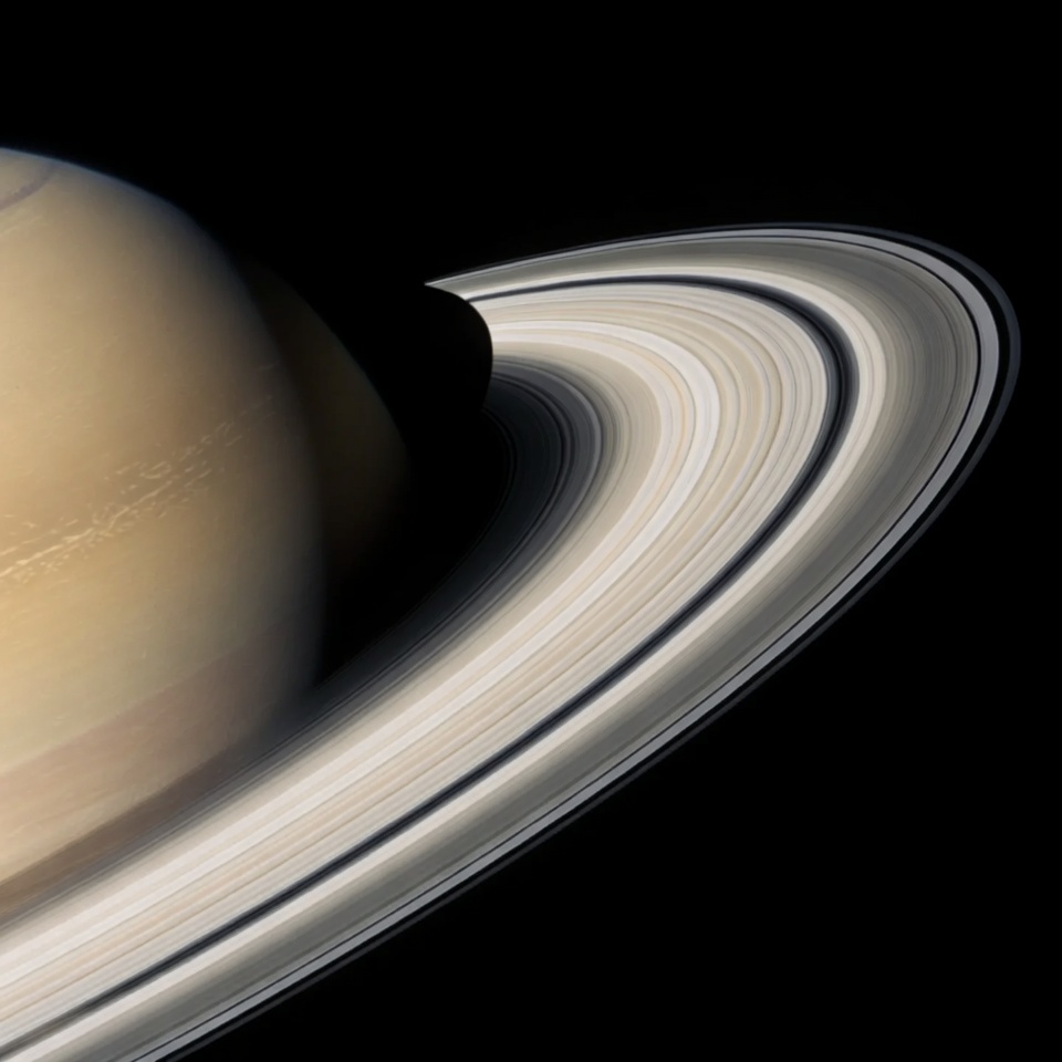 A close-up view of the planet Saturn shows its beige spherical body partially shadowed against a black space background. The planet's iconic thin, bright rings extend prominently from its right side, displaying subtle gaps and variations in brightness. The image captures the rings curving gracefully around the planet's edge.