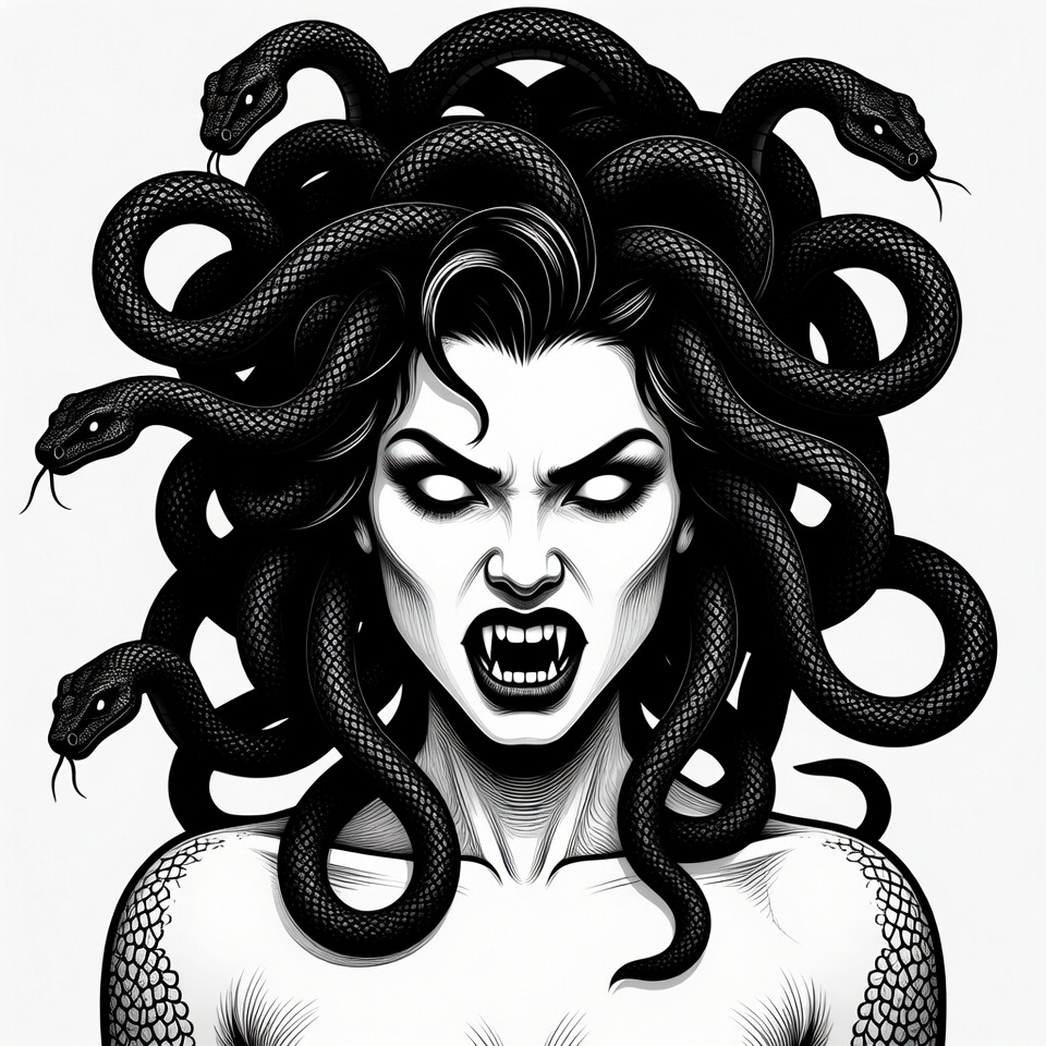 A fierce Medusa woman glares with glowing white eyes and bared fangs. Her hair is composed entirely of twisting black snakes. The black and white illustration features her stern expression and scaly shoulders on an isolated background.