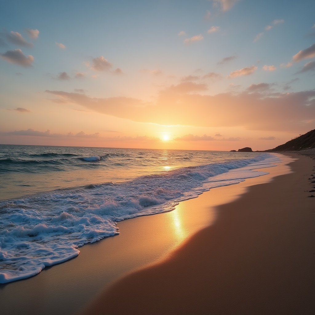 A vibrant sunset illuminates the sky in shades of orange and pink over a sandy beach. Gentle waves crash onto the shore, reflecting the golden sunlight. Distant rocks and scattered clouds enhance the serene ocean horizon.