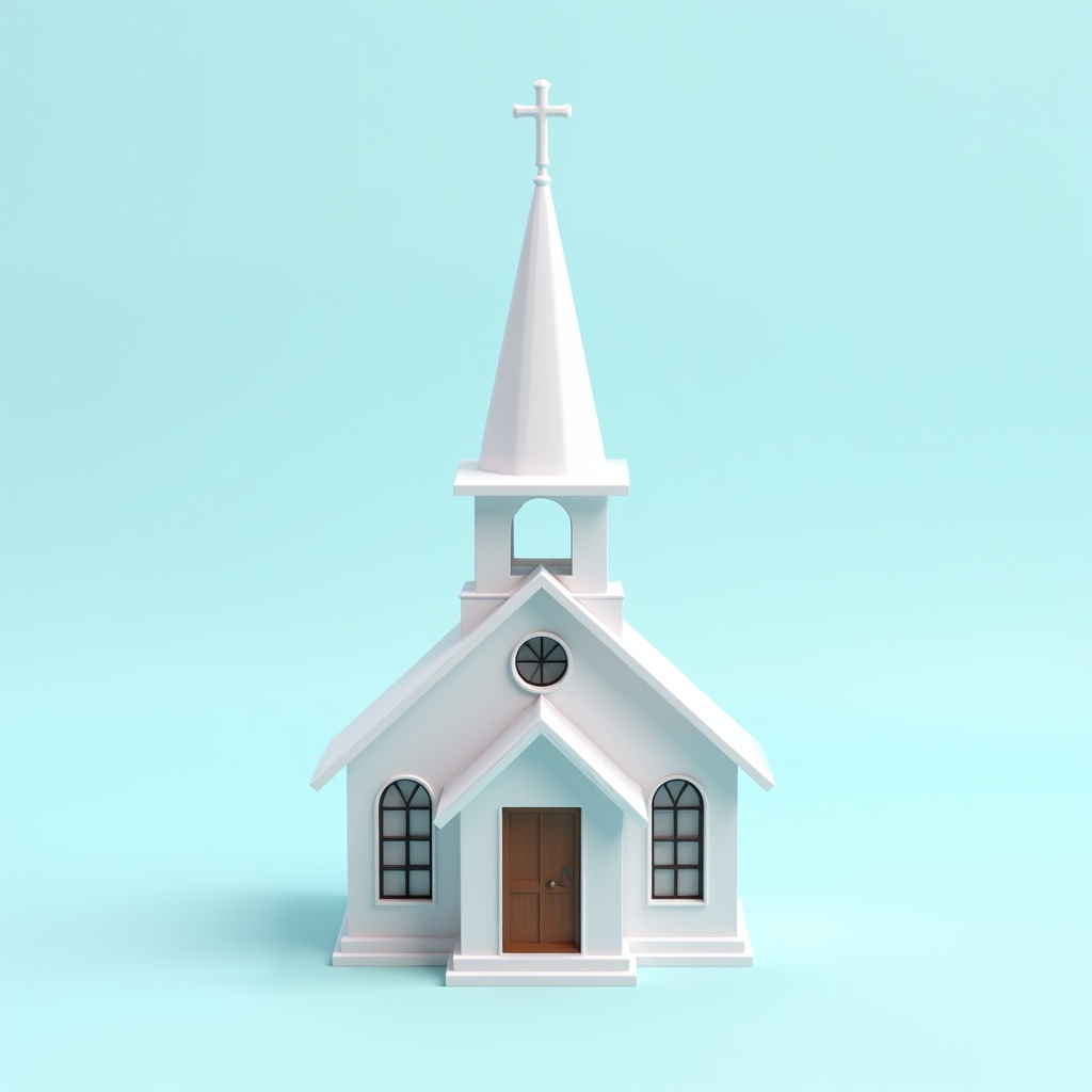 A small white 3D-rendered church with a tall steeple and golden cross stands centered on a solid light blue background. It features arched windows, a brown front door, and clean geometric lines typical of digital illustration. The isolated design highlights the church's simple architecture.