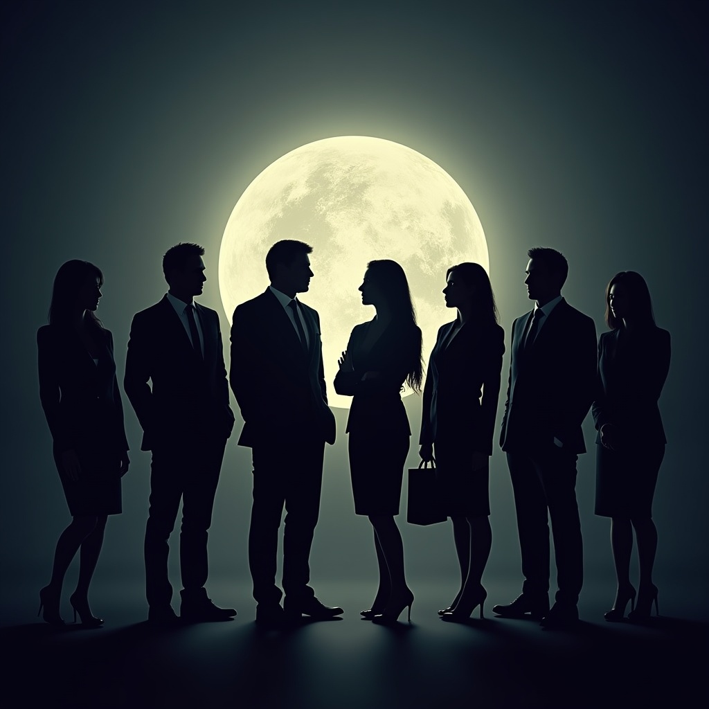 Silhouettes of six business professionals stand together against a dark night sky illuminated by a large full moon. The group includes men in suits and women in dresses and skirts, some holding briefcases and wearing high heels. They are positioned on a plain background with subtle ground reflection.