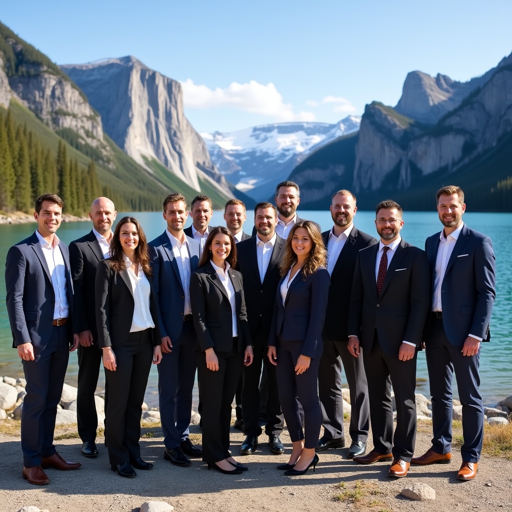 A diverse group of professionals in suits stands together on a rocky shore by a turquoise lake. Snow-capped mountains and pine trees form a dramatic backdrop under a clear blue sky. The team includes several men and women smiling confidently for a group photo.