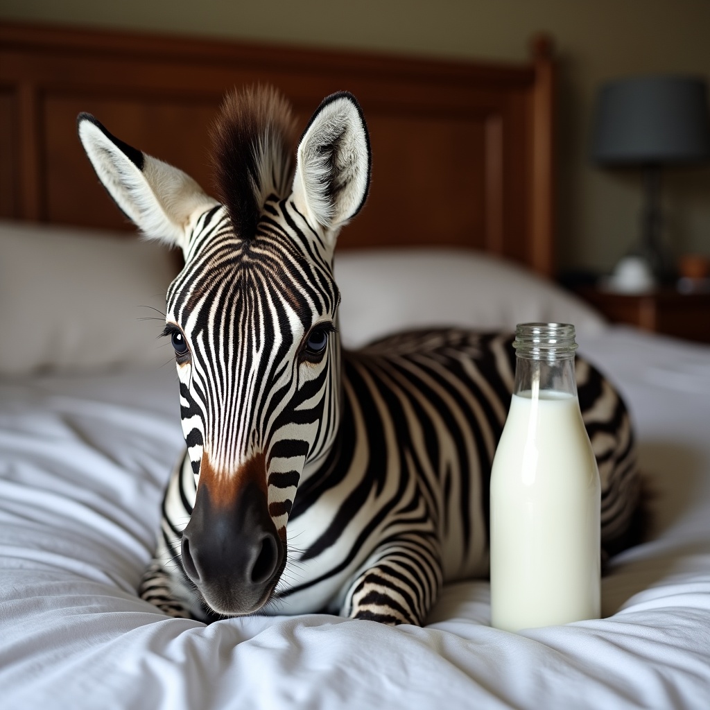 A zebra with black and white stripes lies relaxed on a white bed in a cozy bedroom. A clear glass bottle of milk sits beside it on the bed. The room features wooden furniture, a lamp, and neutral walls.