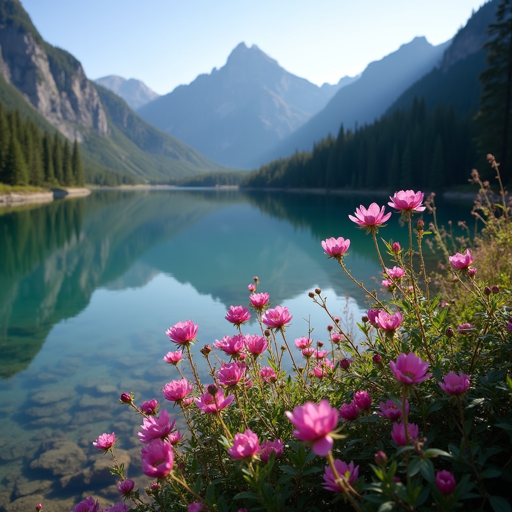 Vibrant pink flowers bloom in the foreground beside a calm turquoise lake. Snow-capped mountains and dense evergreen forests rise sharply in the background under a clear blue sky. The lake's surface perfectly reflects the surrounding peaks and trees.