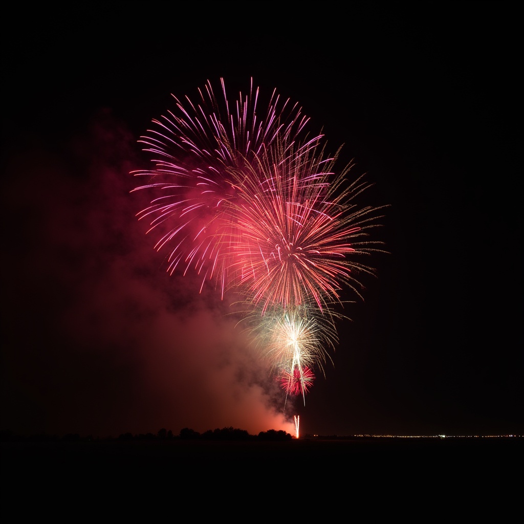 burst fireworks, celebration lights, colorful fireworks, dark background, exploding fireworks, firework explosion, light trails, night display, night sky, pink fireworks, pyrotechnics, red fireworks, smoke trails, yellow fireworks, fireworks