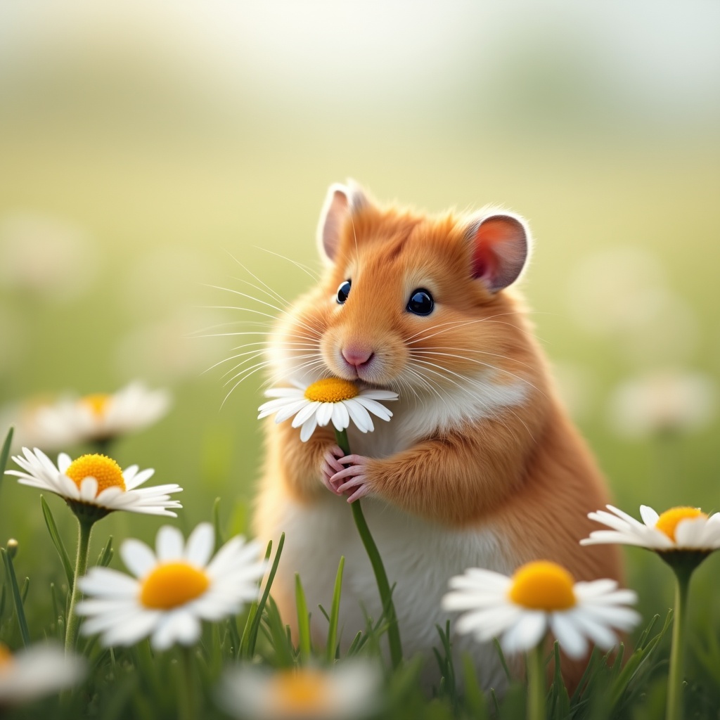A cute orange hamster with big eyes holds a white daisy flower in its paws. It stands in a lush green field surrounded by numerous blooming daisies under a soft blurred background. The hamster nibbles gently on the flower petals.