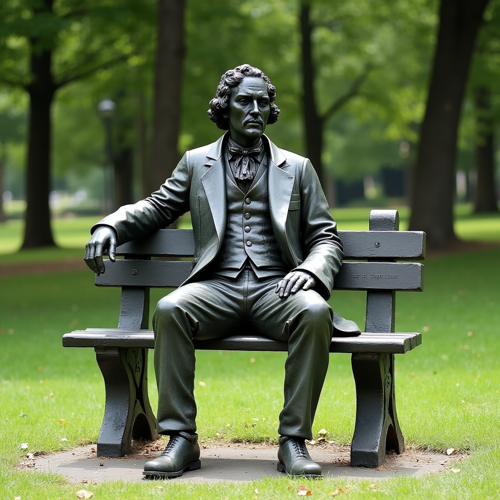 A bronze statue of a man with long curly hair and formal 19th-century attire sits on a black wooden bench in a lush green park. He wears a dark suit, vest, tie, and boots, with one hand resting on the bench and the other in his lap. Tall green trees and grass surround the statue on a sunny day.