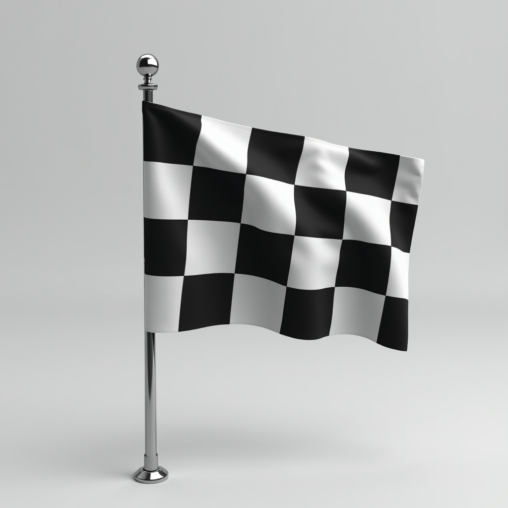 3D render, black white flag, checkered pattern, clipart, finish line flag, flag pole, illustration, isolated background, motorsport flag, racing flag, silver pole, waving flag, checkered flag