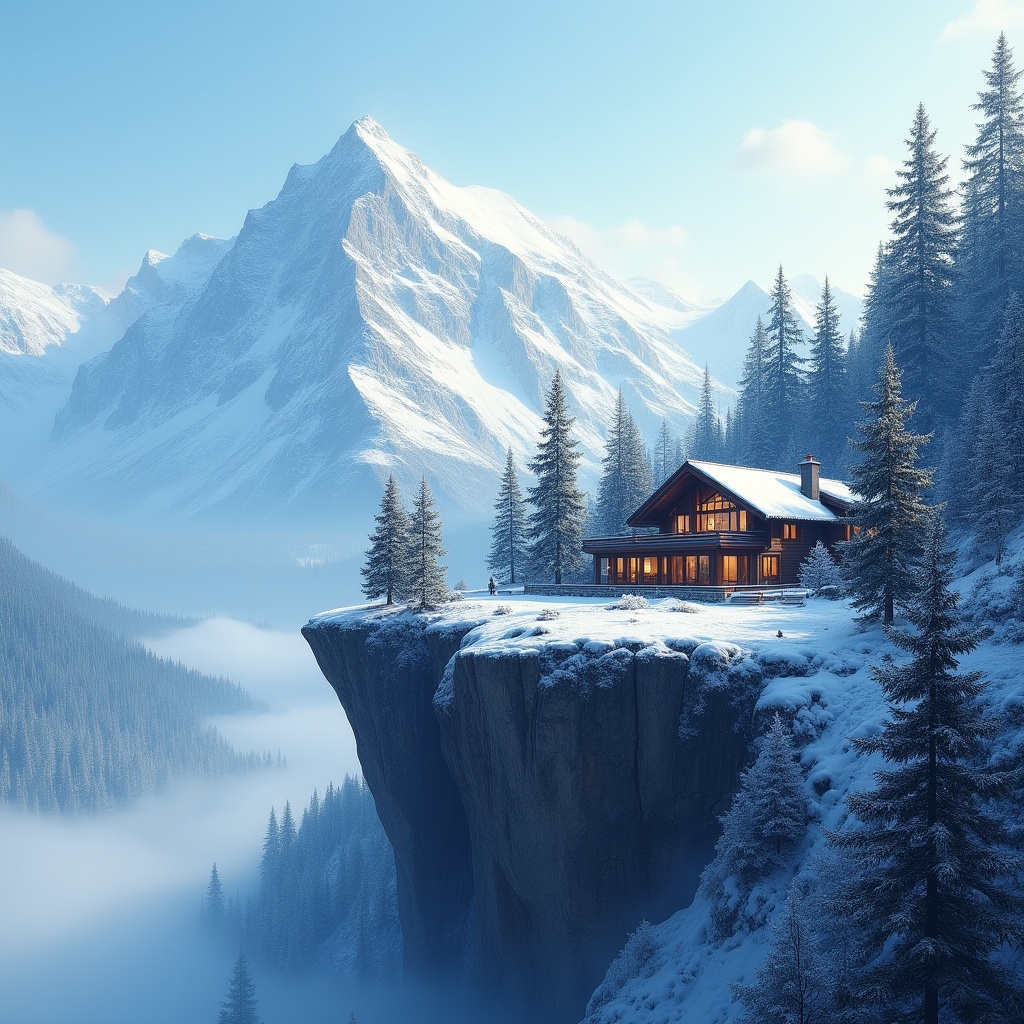 A wooden chalet with a sloped roof and warm lit windows sits perched on a snowy cliff edge. Snow-capped mountains rise dramatically in the background, surrounded by evergreen pine trees. Misty valleys and clouds add depth to the winter landscape.
