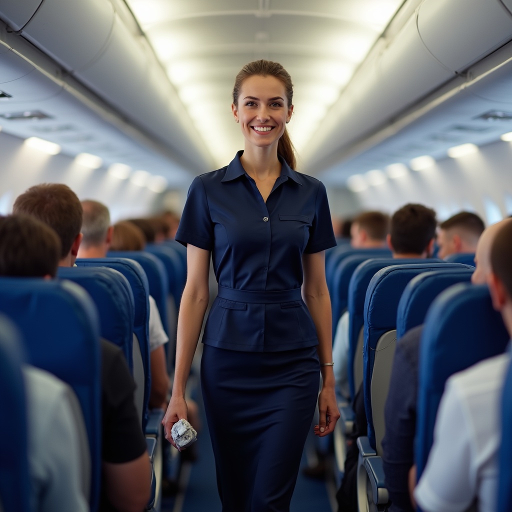 A smiling White woman dressed as a flight attendant in a navy blue uniform walks down the aisle of a commercial airplane. She has her brown hair in a ponytail and holds a small item in her hand. Numerous male passengers sit in blue seats on both sides, facing forward.