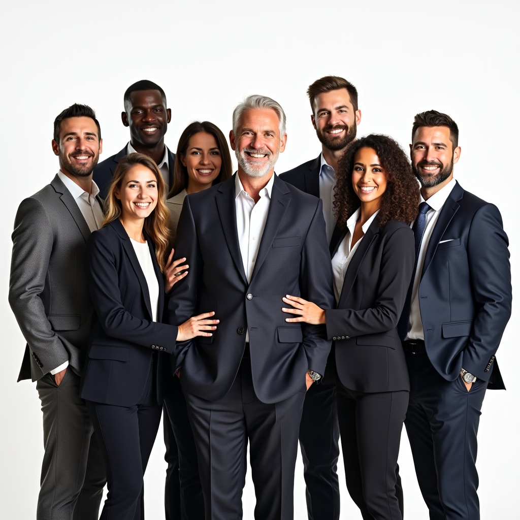 A diverse group of professionals stands together in business attire against a white background. The team includes men and women of various ethnicities, with a mature man in a dark suit at the center, smiling confidently. They wear suits, blazers, and dress shirts, posing closely in a group formation.