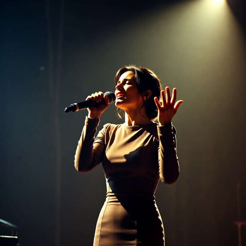 A woman with dark hair styled in a bun passionately sings into a microphone on a dimly lit stage. She wears a form-fitting beige long-sleeve dress and raises one hand expressively. Spotlights illuminate her against a dark background with stage equipment.
