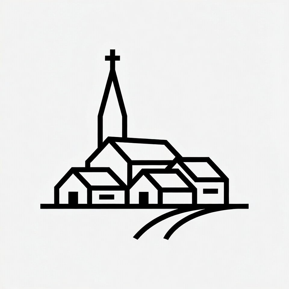 Black line drawing of a tall church with a steeple and cross surrounded by several small houses. A curved path runs in front of the buildings on a plain white background. The illustration features clean, minimalist outlines.
