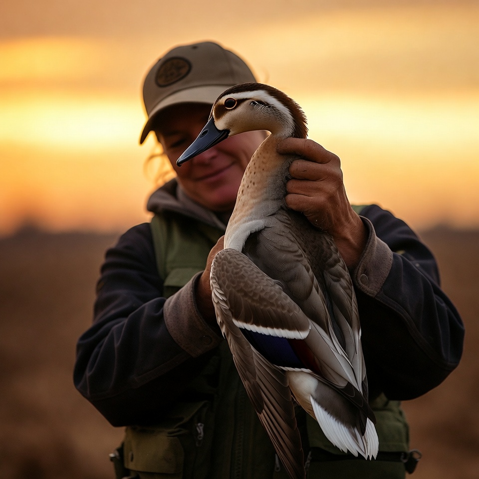White, beak, bird, birdwatching, cap, duck, feathers, golden hour, hands, holding bird, hunter, khaki vest, male, nature, orange sky, outdoors, sunset, waterfowl, whistling duck, wildlife, wings, man