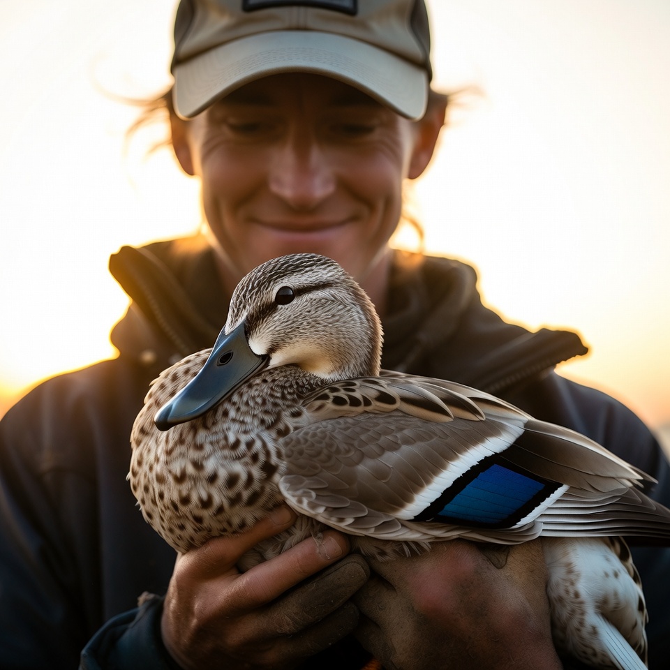 White, bird, blue wing, brown duck, cap, duck, feathers, feathers, golden hour, hands, holding duck, jacket, male, mallard duck, nature, outdoors, portrait, smiling man, sunset, waterfowl, wildlife, man