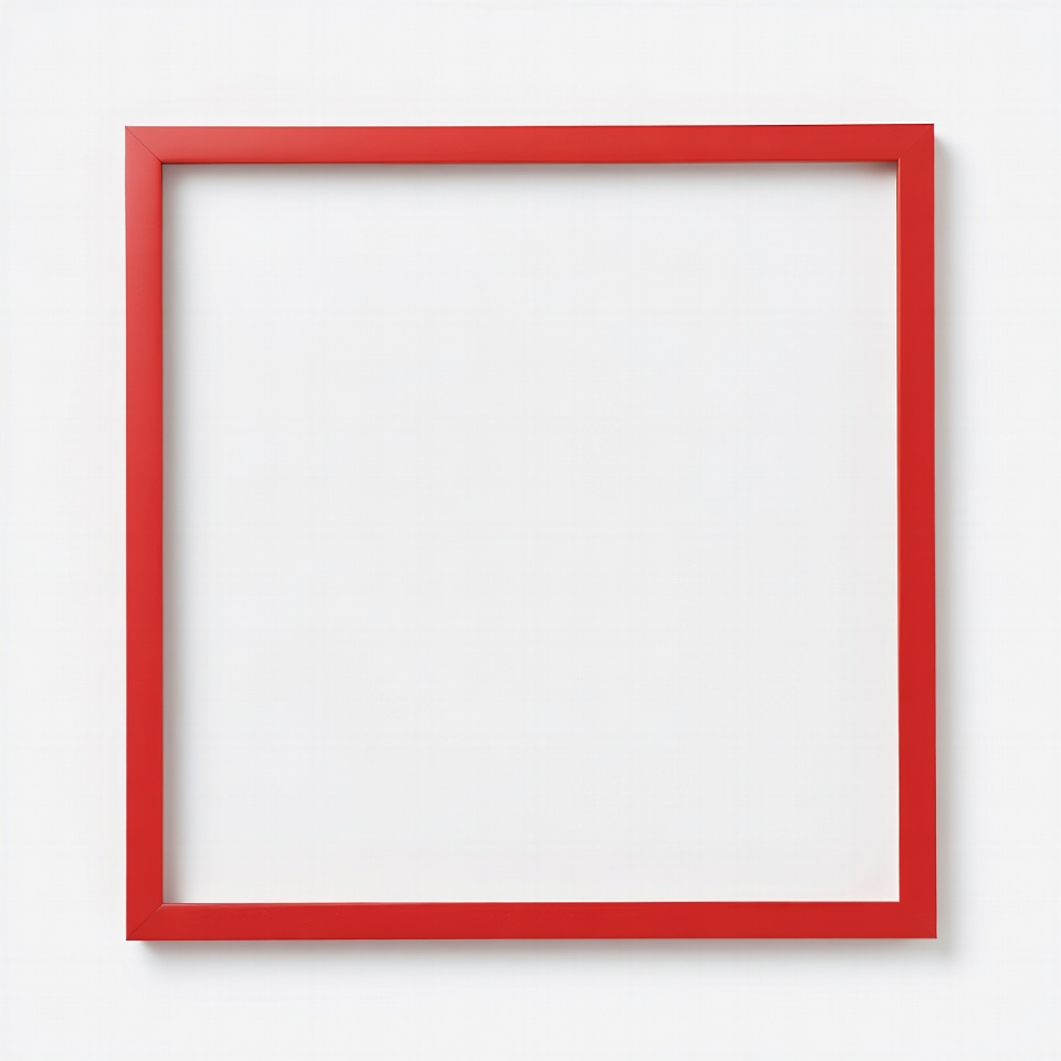 A square picture frame with a bright red border stands against a white background. The frame is empty, showcasing a clean white mat inside. It is positioned straight on, perfect for displaying artwork or photos.