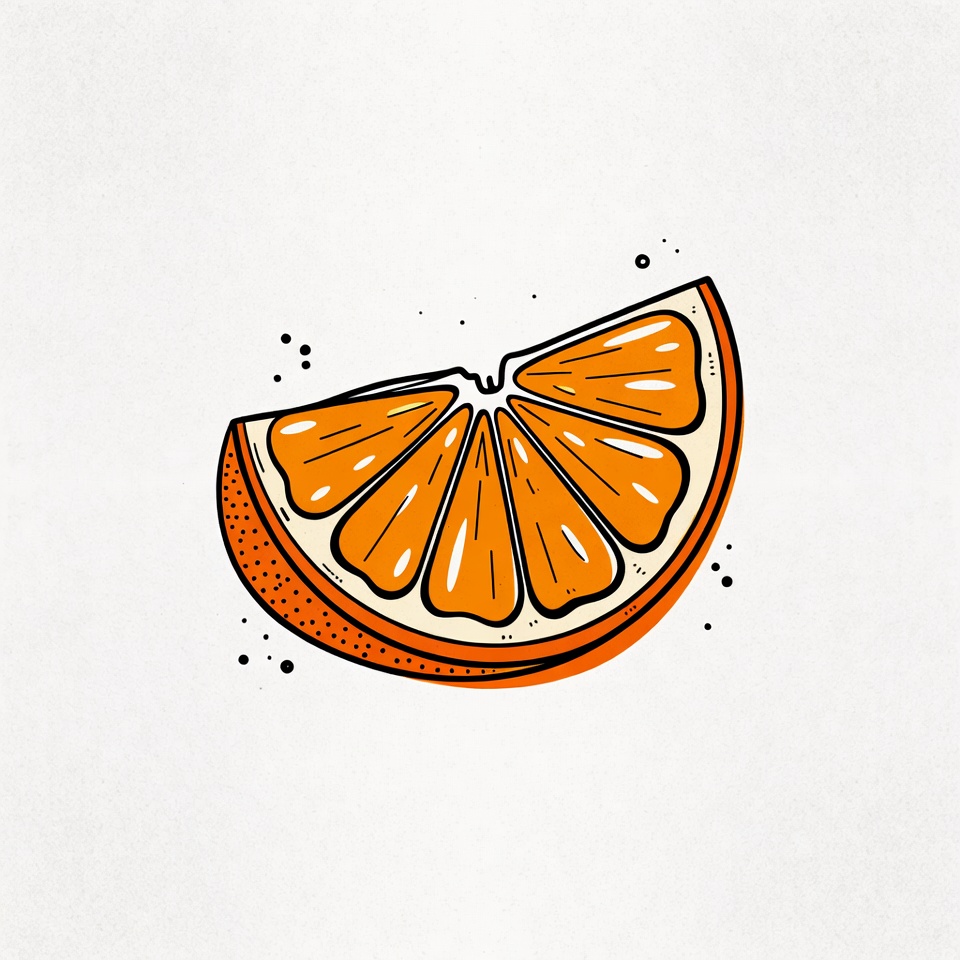 A vibrant hand-drawn illustration of a sliced orange on a white background. The orange features detailed orange segments with white pith and juice droplets. It has a cartoonish style with bold outlines.
