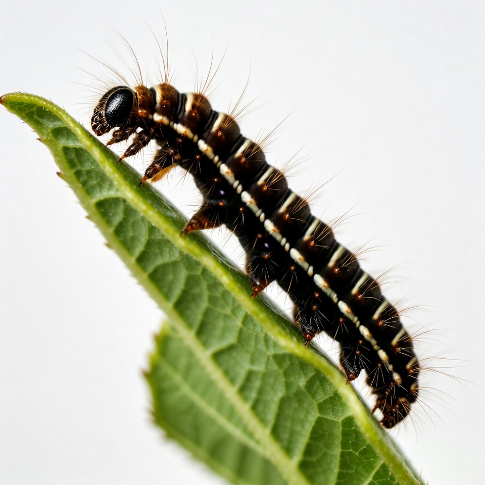 A detailed close-up shows a black and orange striped caterpillar crawling on a green leaf. The caterpillar has hairy tufts and prominent white stripes along its segmented body. It grips the veined leaf surface with its legs.