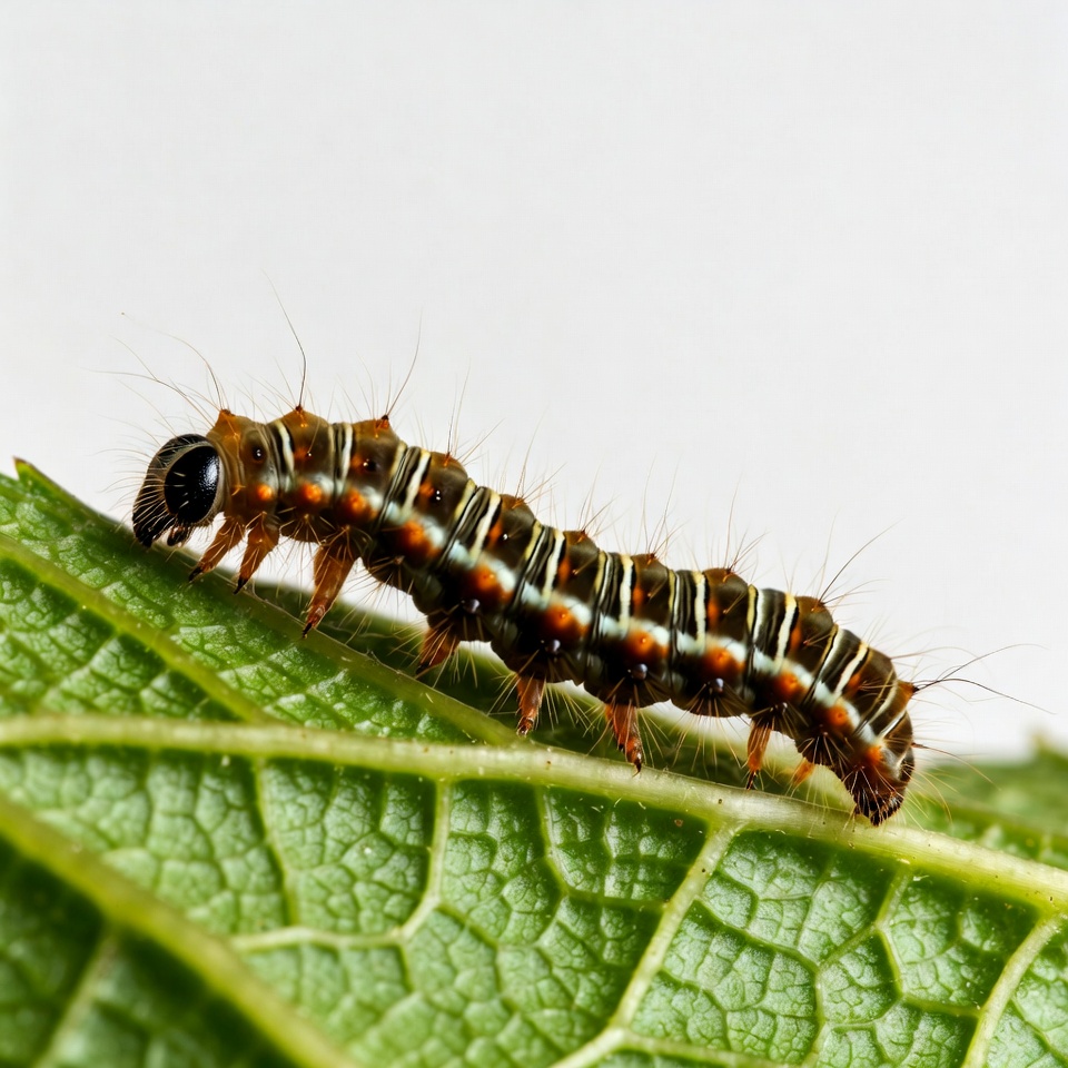 A striped caterpillar with brown, orange, and black bands crawls on a large green leaf. Its body features distinct segments with fine hairs and a prominent head. The leaf has prominent veins and is set against a white background.