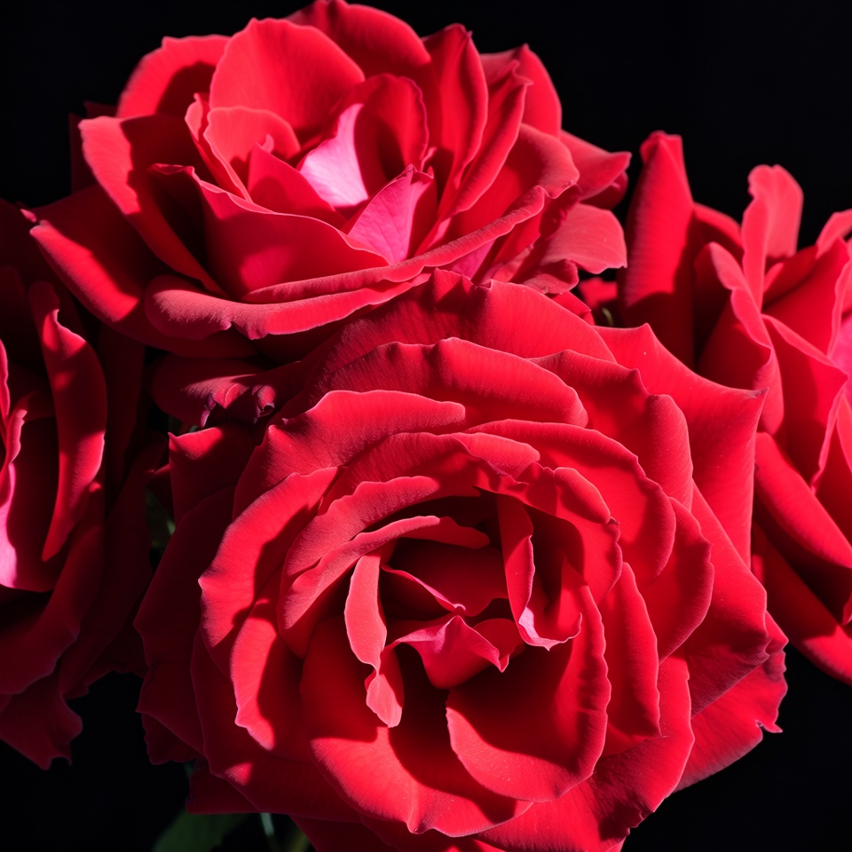A close-up of vibrant red roses with layered petals against a solid black background. The flowers are tightly clustered, showcasing their rich crimson color and delicate textures. Subtle highlights accentuate the curves and edges of the petals.