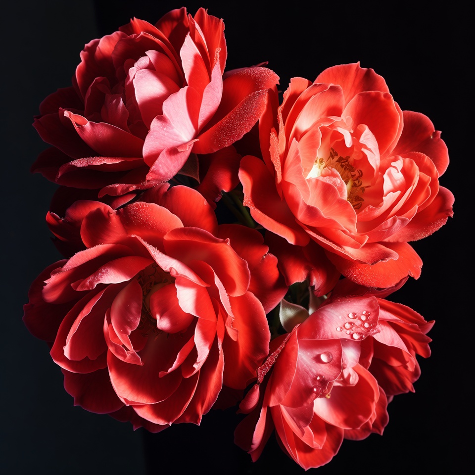 black background, blooming roses, dewdrops, floral closeup, flower cluster, fresh roses, garden roses, petals, red flowers, rose bouquet, rose stems, roses, vibrant red, water droplets, red roses