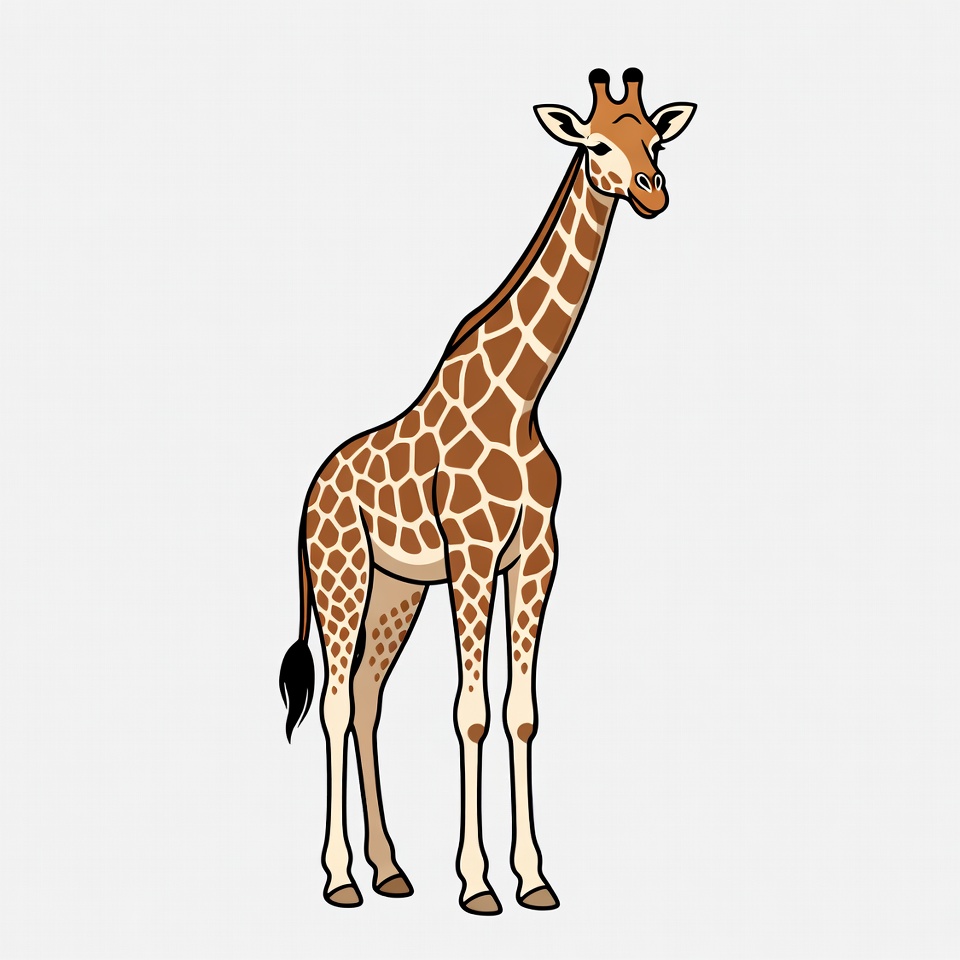 A cartoon giraffe with brown spots stands on a plain white background. It faces slightly to the left with its long neck extended upward and a short tail. The illustration features simple lines and vibrant colors.