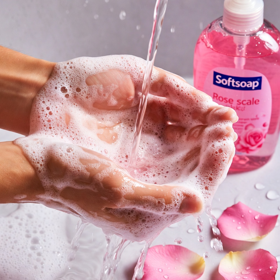Softsoap, bubbles, clean hands, foam, hand soap, handwashing, hygiene, liquid soap, petals, pink bottle, pink soap, rose milkshake, rose petals, rose soap, running water, soap bottle, soap suds, washing hands, white background, hands