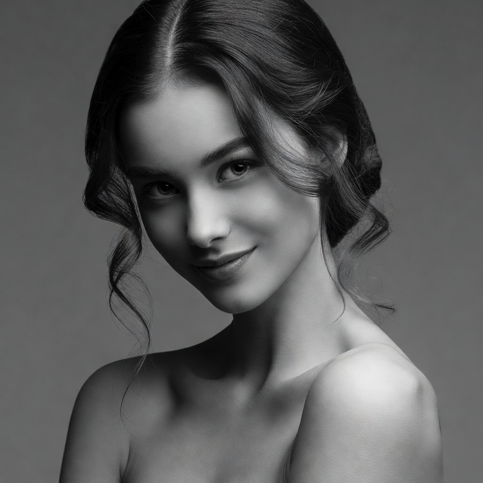 White, bare shoulders, beautiful, black and white, closeup, dark hair, elegant, female, gray background, headshot, portrait, soft lighting, subtle smile, updo hairstyle, wavy hair, young woman, woman