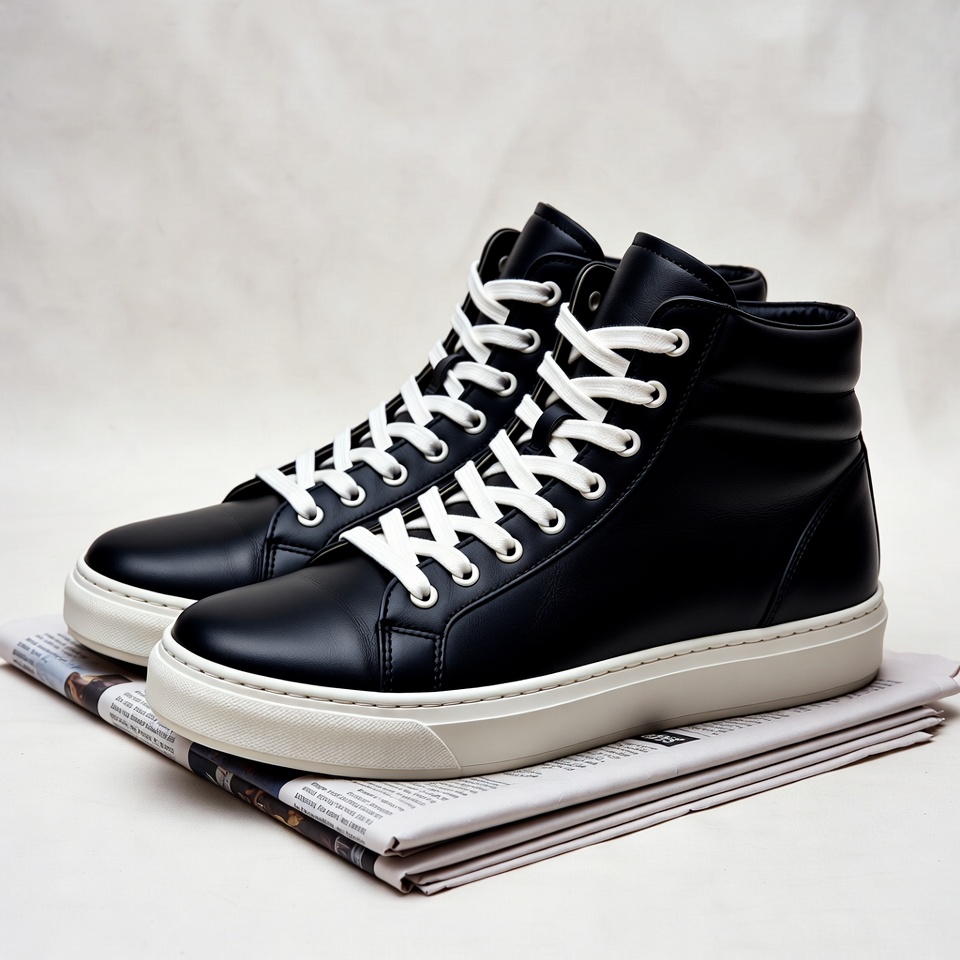 casual sneakers, fashion footwear, folded newspaper, high-top shoes, high-tops, lace-up shoes, leather sneakers, men's shoes, product shot, shoe photography, sneakers on newspaper, white background, white laces, women's shoes, black sneakers