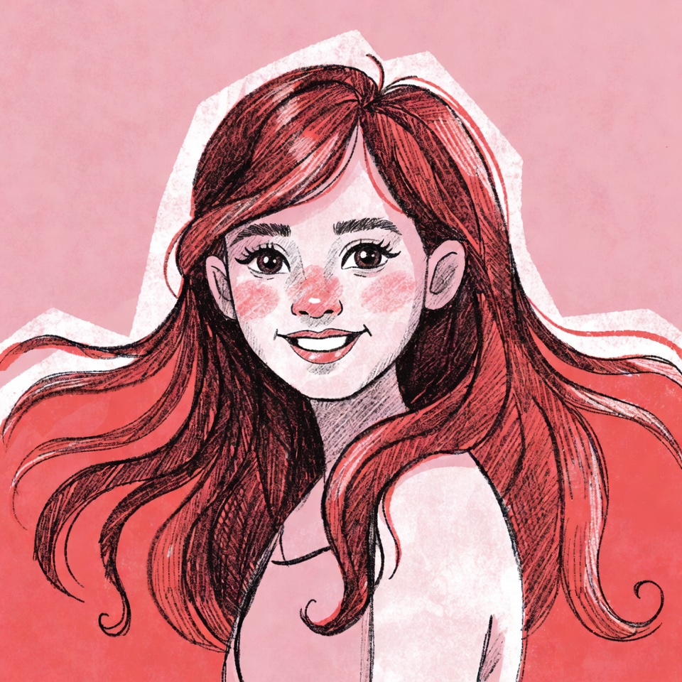 A hand-drawn illustration of a young woman with long wavy red hair smiling happily. She has rosy cheeks, large expressive eyes, and wears a white top. The artwork features a pink background with white outlines and a sketchy style.