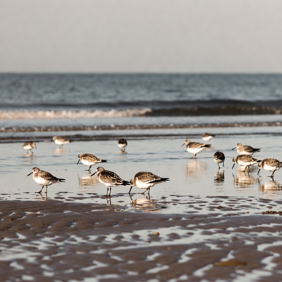beach, birds, brown birds, coastal, flock, foraging, group, migratory birds, nature, ocean, reflections, sand, seashore, shallow water, shore, shorebirds, tide, wading birds, waves, wet sand, white birds, wildlife, sandpipers