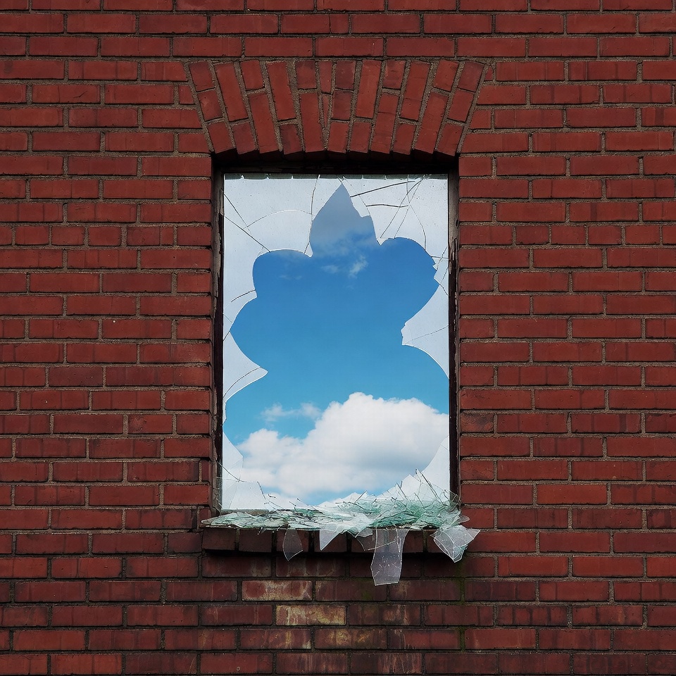 A red brick wall features a rectangular window with shattered glass. Through the broken panes, a bright blue sky and white clouds are visible. Shards of glass cling to the window frame.