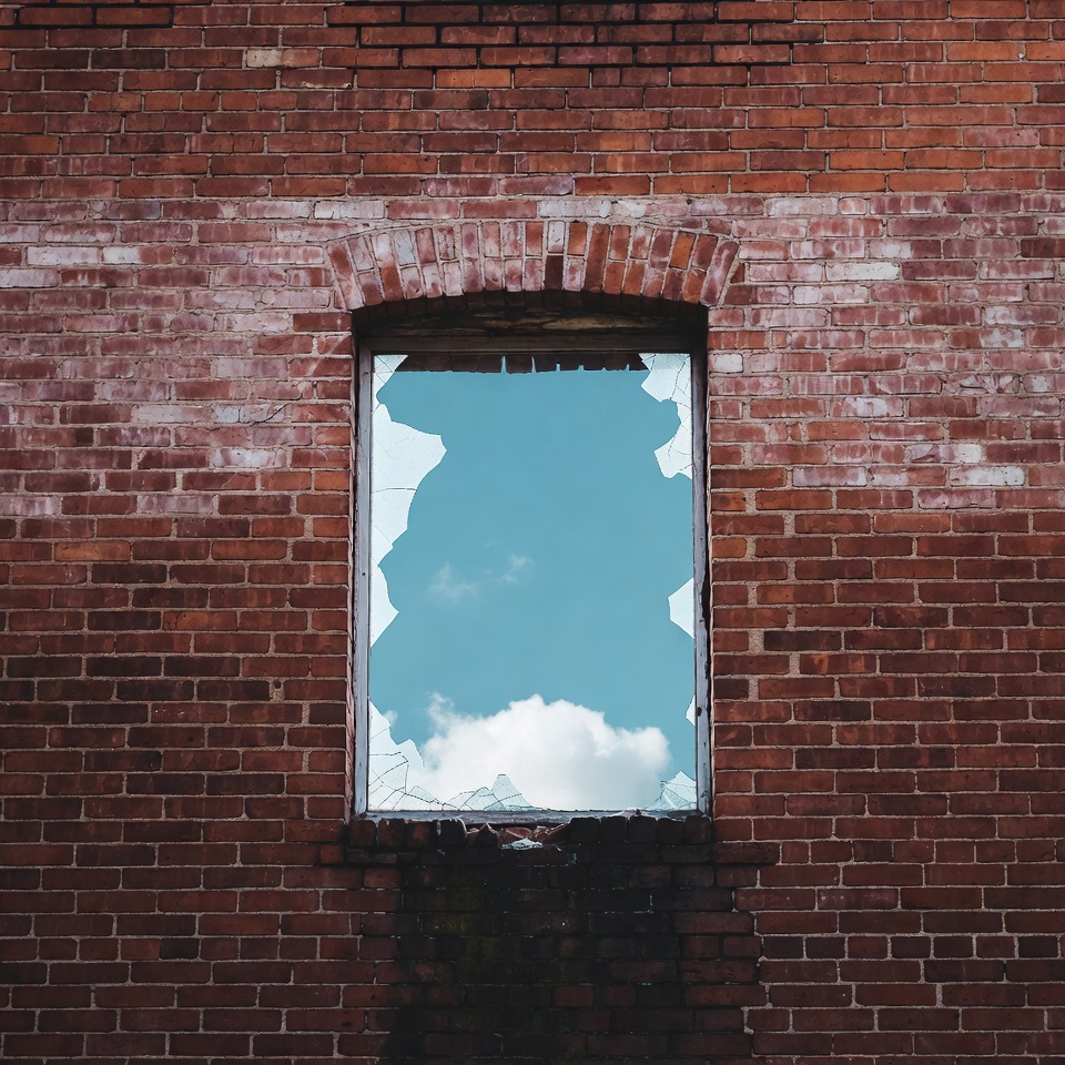 A red brick wall features a tall arched window with broken glass panes. Bright blue sky and clouds are visible through the shattered window. The surrounding bricks show weathering and decay.