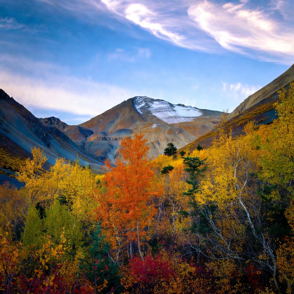 alpine valley, aspen trees, blue sky, colorful leaves, fall foliage, forest trail, golden trees, mountain valley, nature landscape, orange leaves, outdoor scenery, pine trees, pink clouds, red foliage, rocky slopes, scenic view, seasonal change, snow-capped peak, vibrant colors, autumn mountains