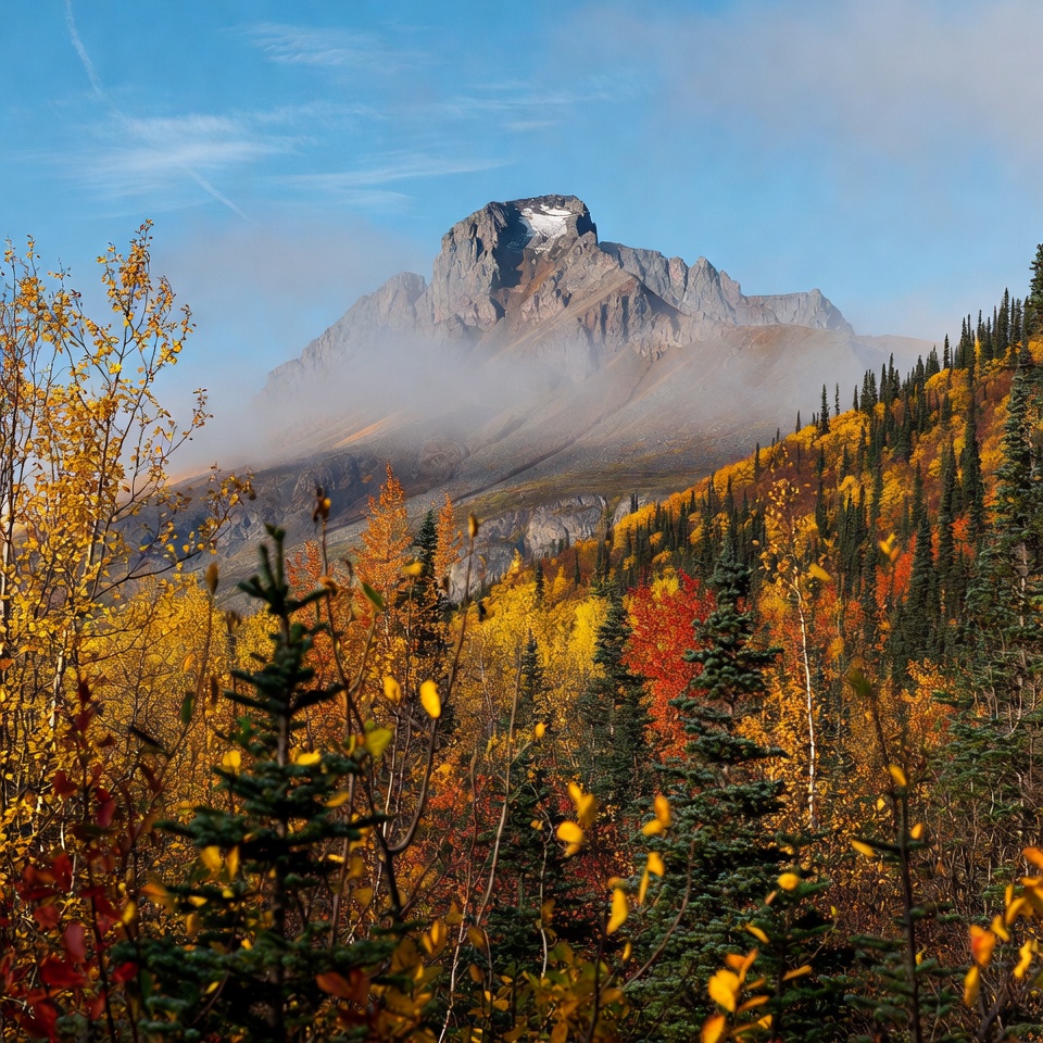 autumn, blue sky, clouds, evergreens, fall foliage, fog, forest, landscape, nature, orange leaves, outdoors, red leaves, rocky mountain, seasonal change, snow peak, trees, vibrant colors, wilderness, yellow leaves, mountain