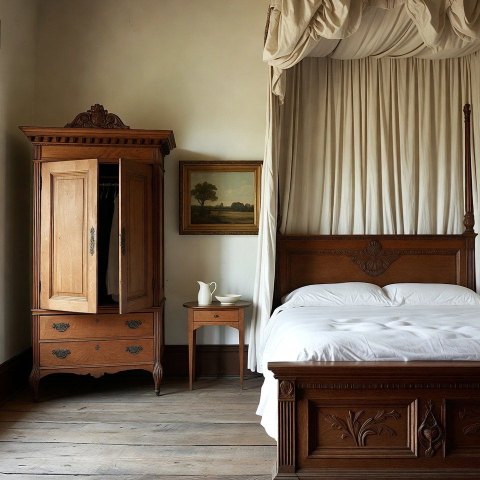 bedroom furniture, beige drapes, canopy bed, carved furniture, classic decor, elegant room, four-poster bed, hardwood floor, landscape painting, open cabinet, ornate woodwork, side table, vintage interior, wardrobe, white bedding, white bowl, white pitcher, wooden armoire, wooden bed frame, antique bedroom
