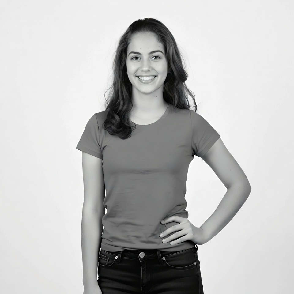 Latino, casual clothing, cheerful smile, female, gray t-shirt, hand on hip, headshot, portrait, short sleeves, skinny jeans, smiling girl, standing pose, wavy hair, white background, young woman, teenage girl