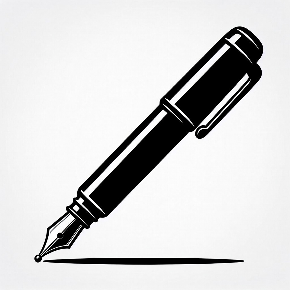 A black silhouette illustration of a fountain pen with a shiny nib and clip. The pen is angled diagonally with a subtle shadow beneath it. It features a detailed ink nib point on an isolated white background.