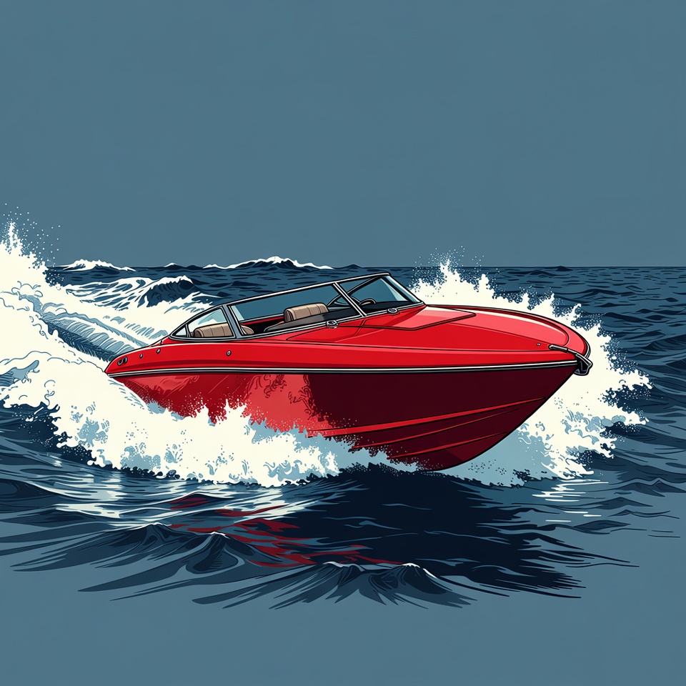 A vibrant red speedboat with a sleek design speeds across choppy ocean waves, creating large white splashes. The boat features an open cockpit and tan seats, illustrated in a bold graphic style against a dark blue sea. Water trails behind as it cuts through the water dynamically.