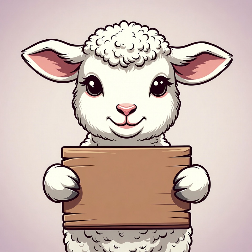 A cute cartoon lamb with fluffy white wool and big expressive eyes holds a blank wooden sign with its front hooves. The lamb has pink ears, a smiling mouth, and stands on a light purple background. The illustration features bold outlines and vibrant colors.