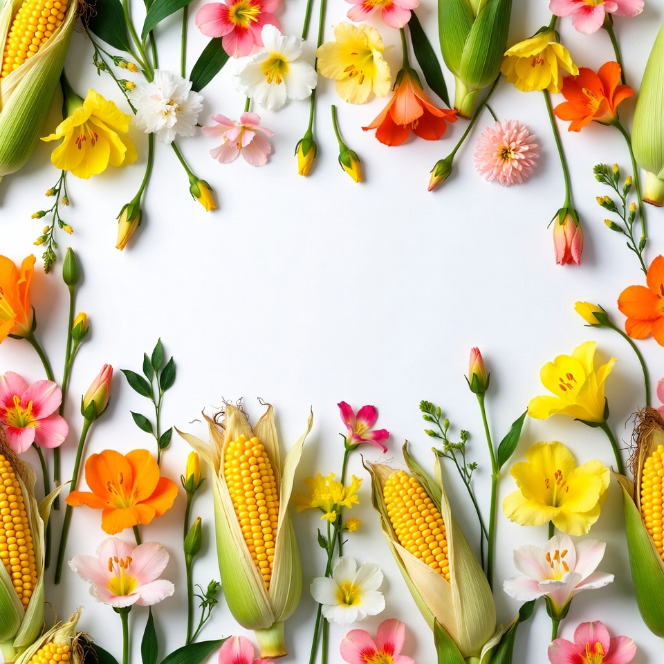 Fresh corn cobs and vibrant flowers are arranged symmetrically on a plain white background. The composition features yellow corn ears surrounded by colorful blooms including orange marigolds, pink and white daisies, and yellow daffodils. Green leaves and stems add natural texture to the flat lay design.