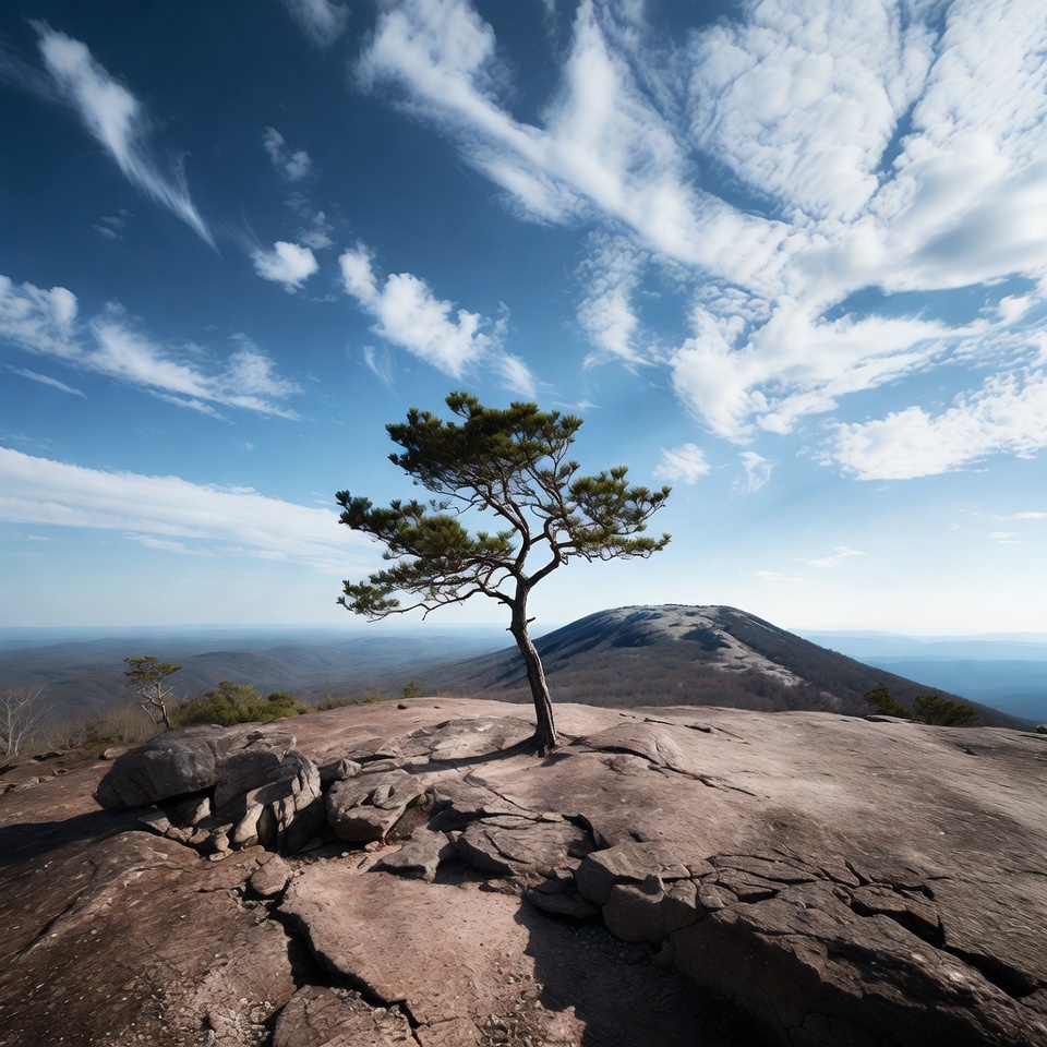 Appalachian mountains, blue sky, clear day, coniferous tree, distant peak, granite rocks, landscape, lone tree, mountain summit, nature, outdoors, rocky outcrop, scenic view, tree on rock, white clouds, windswept tree, pine tree