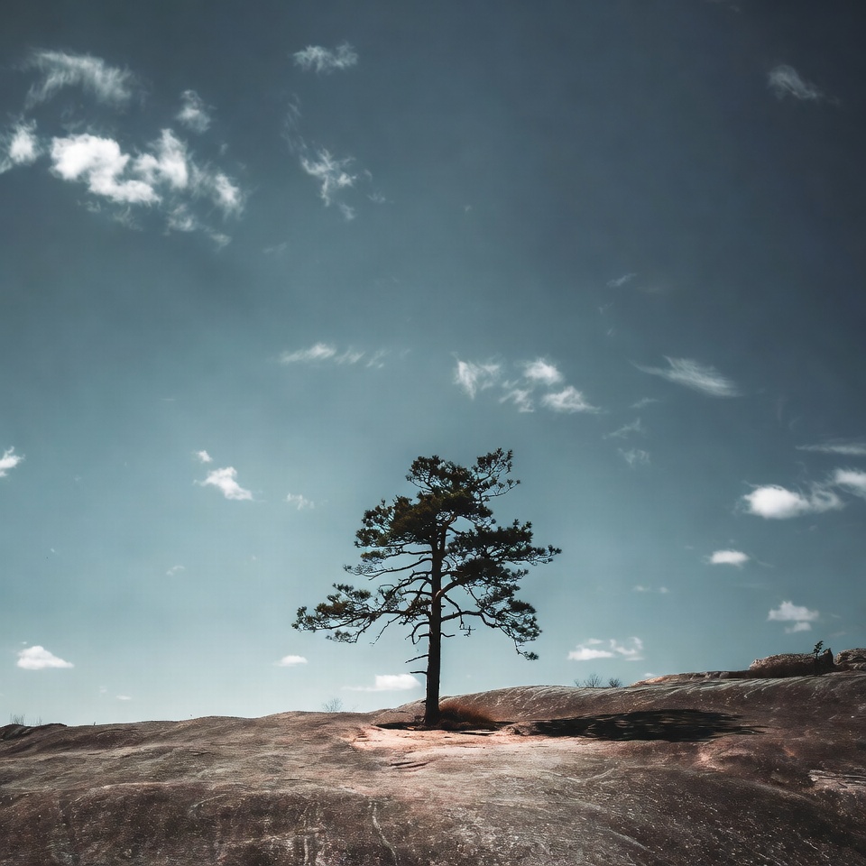 Lone pine tree on rocky hill