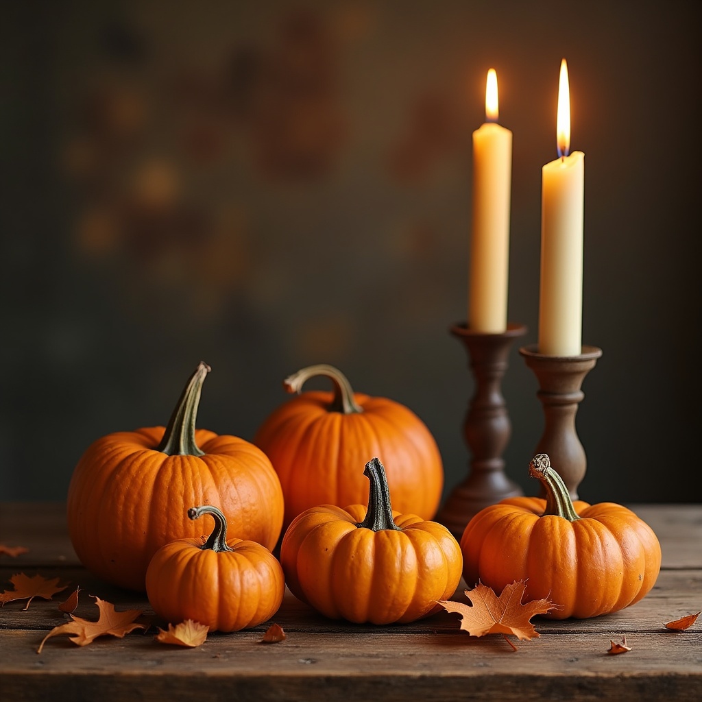 Pumpkins and Candles on Wooden Table