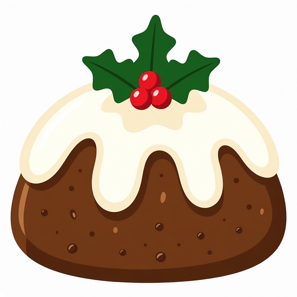 Christmas dessert, cartoon pudding, clipart, festive dessert, green leaves, holiday food, holly, illustration, isolated background, pudding, red berries, white icing, Christmas pudding