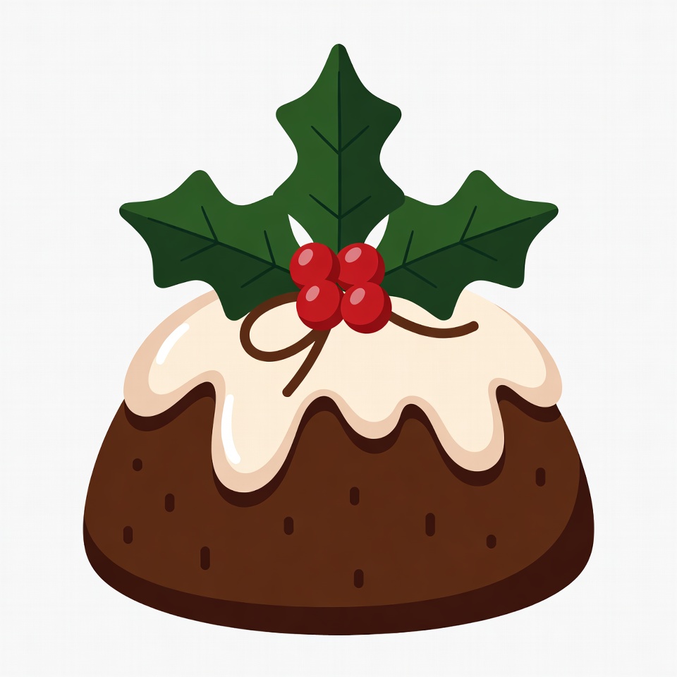 Christmas food, cartoon, clipart, dripping sauce, festive dessert, holiday food, holly leaves, illustration, isolated background, plum pudding, red berries, white icing, Christmas pudding