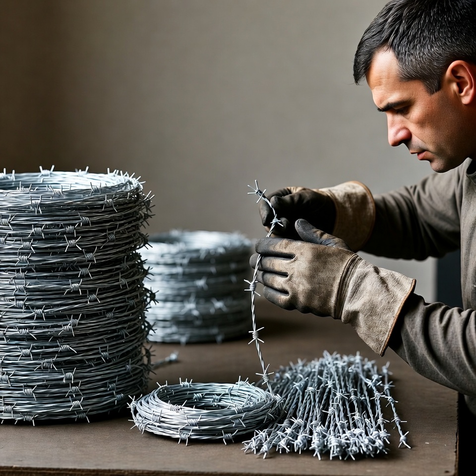 A man with short dark hair wears gloves and a brown shirt while handling barbed wire in an industrial setting. He stands beside large coils of barbed wire on a wooden table. Several rolls of wire are stacked nearby on the floor.
