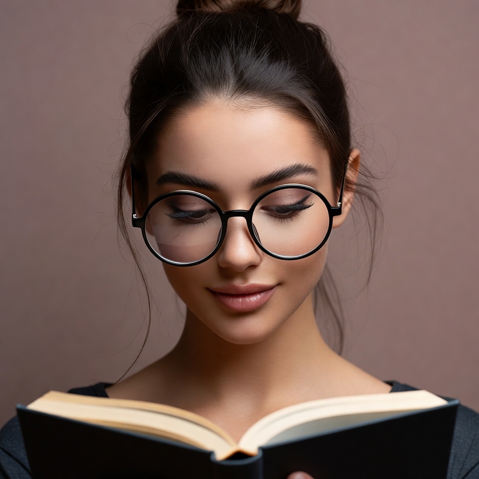 A young woman with dark hair in a bun wears large round glasses and reads an open book. She has a subtle smile and gazes downward at the pages. Her face is centered against a plain beige background.