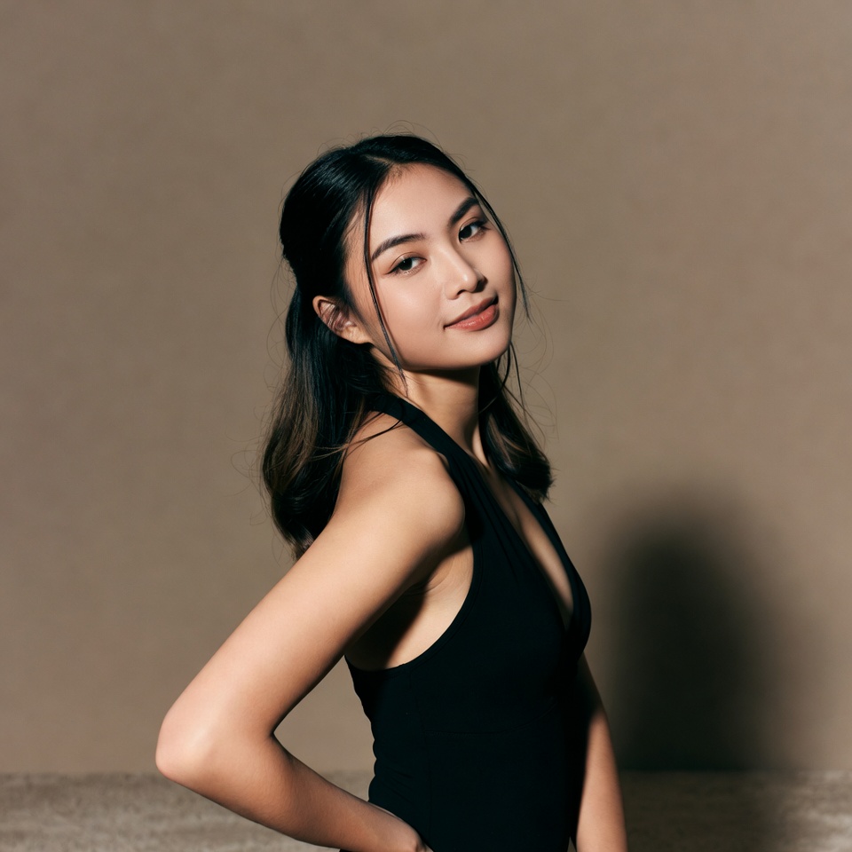 A young Asian woman with long dark hair tied in a ponytail stands with her back turned slightly, looking over her shoulder. She wears a sleeveless black V-neck dress that accentuates her figure. The image features a neutral beige background with soft lighting.